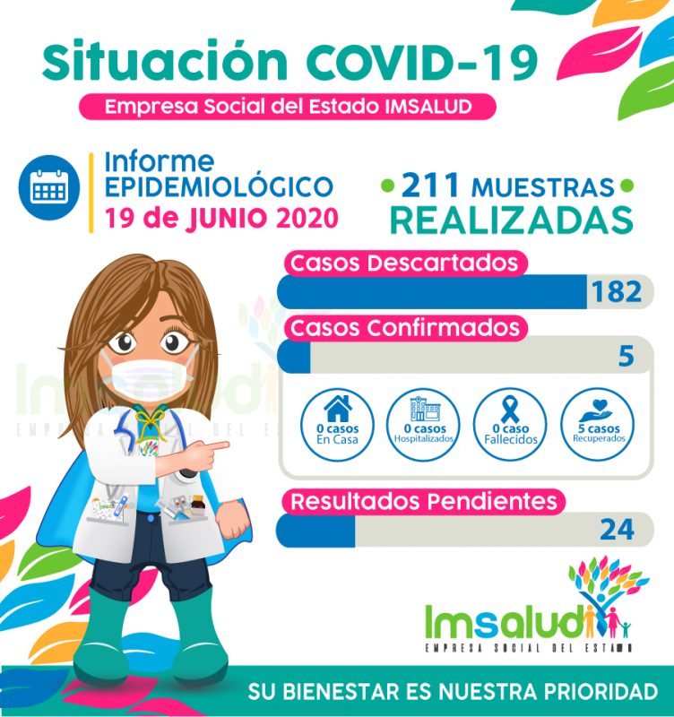 Hoy las cifras nos indican que de 211 muestras realizadas por la ESE IMSALUD durante la pandemia Covid-19, solo 5 han sido confirmados y a la fecha ya se encuentran recuperados. Para más información puedes acceder a los datos del informe