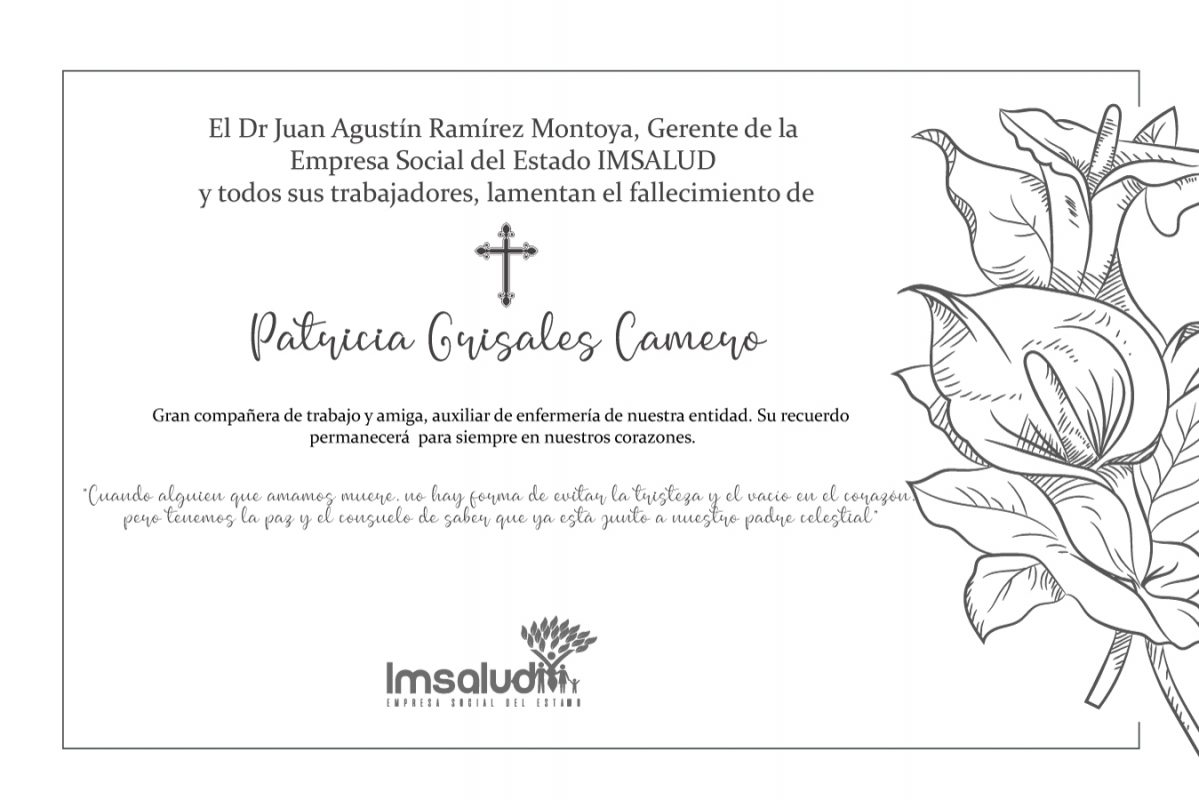 El Dr. Juan Agustín Ramírez Montoya, Gerente de la Empresa Social del Estado IMSALUD y todos sus trabajadores expresan sentidas y profundas condolencias ante el fallecimiento de la señora Patricia Grisales Camero auxiliar de enfermería de la IPS Santa Ana.